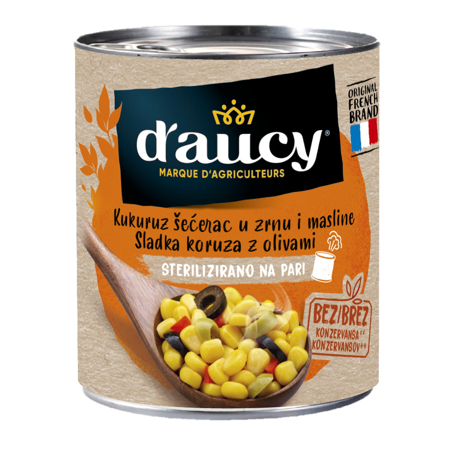 Maïs doux en grains (63%), eau, olives en rondelles (11%), poivrons rouges en dés, persil, sel, antioxydant : acide ascorbique