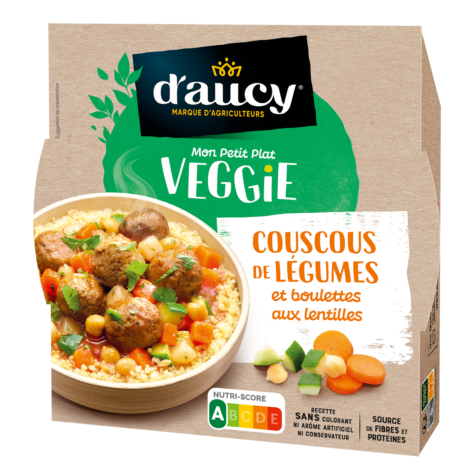 Almôndegas de lentilhas laranja 18,5% (água, lentilhas laranja 4%, proteínas de soja, amido de ervilha, proteínas de ervilhas, especiarias e ervas aromáticas, óleo de colza, clara de ovo em pó, sal), água, bulgur preparado 13,5% (água, trigo duro pré-cozido moído, sal, óleo de colza), sêmola de cuscuz preparada 13,5% (água, sêmola de trigo duro, óleo de colza, sal), cenouras 11,5%, nabos 7,5%, curgetes 7,5%, grão-de-bico reidratado 3,1%, concentrado de tomate, azeite virgem, amido, sal, especiarias, coentros, aromas naturais (contém aipo).