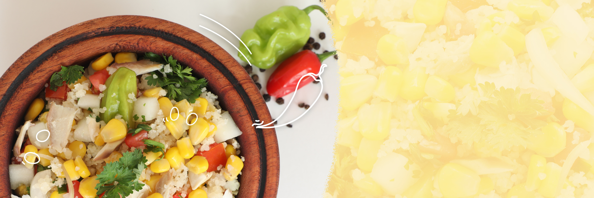 1. Misture o milho escorrido, 200 g de peixe fumado desfiado, 1 pepino, 2 tomates cortados em cubos, 2 malaguetas sem caule, meio molho de salsa picado e 1 cebola laminada.