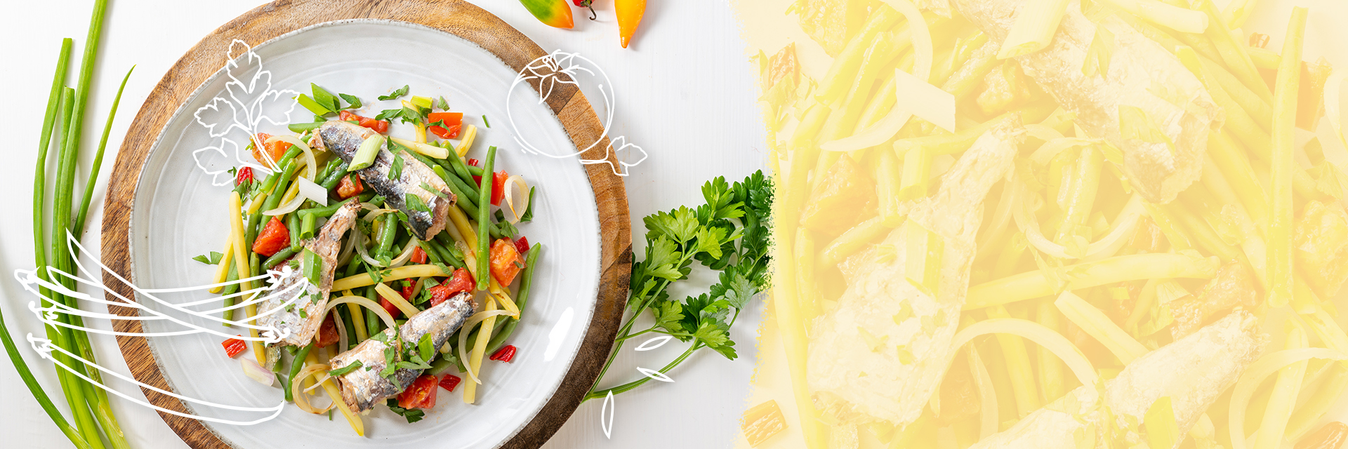 Duo de feijão-verde e feijão-manteiga com tomate e sardinhas