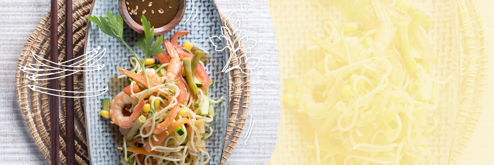 Página inicial do sítio > Ideias de Receitas > Massa salteada com camarão e legumes