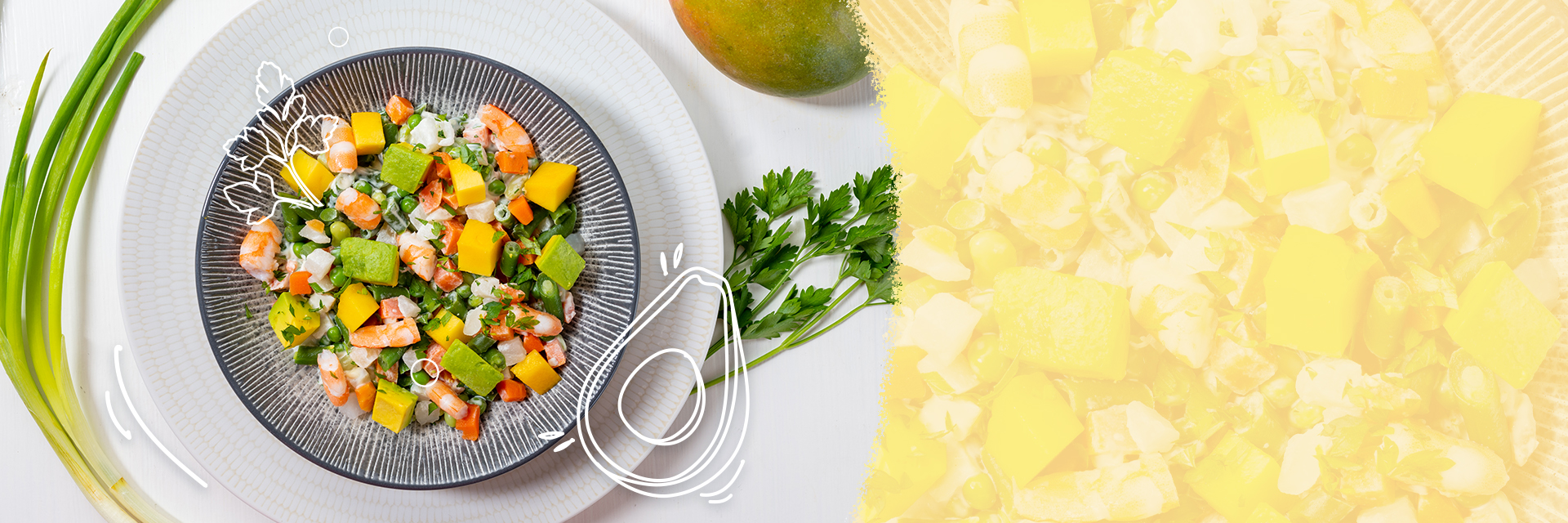 Página inicial do sítio > Ideias de Receitas > Salada de macedónia com abacate, manga e gambas